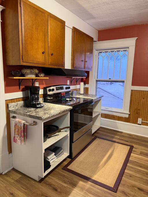 4Rest has a full kitchen and bathroom. We chose not to have a living room but put small TVs w Prime in each bedroom. This unit is on the 2nd floor. There are also two other units available to rent. One in the basement. And one on the main floor. Each unit has a separate lockable entrance. All units have access to a shared coin-op laundry room in the basement. Outside there’s a grill and fire pit for you to enjoy.