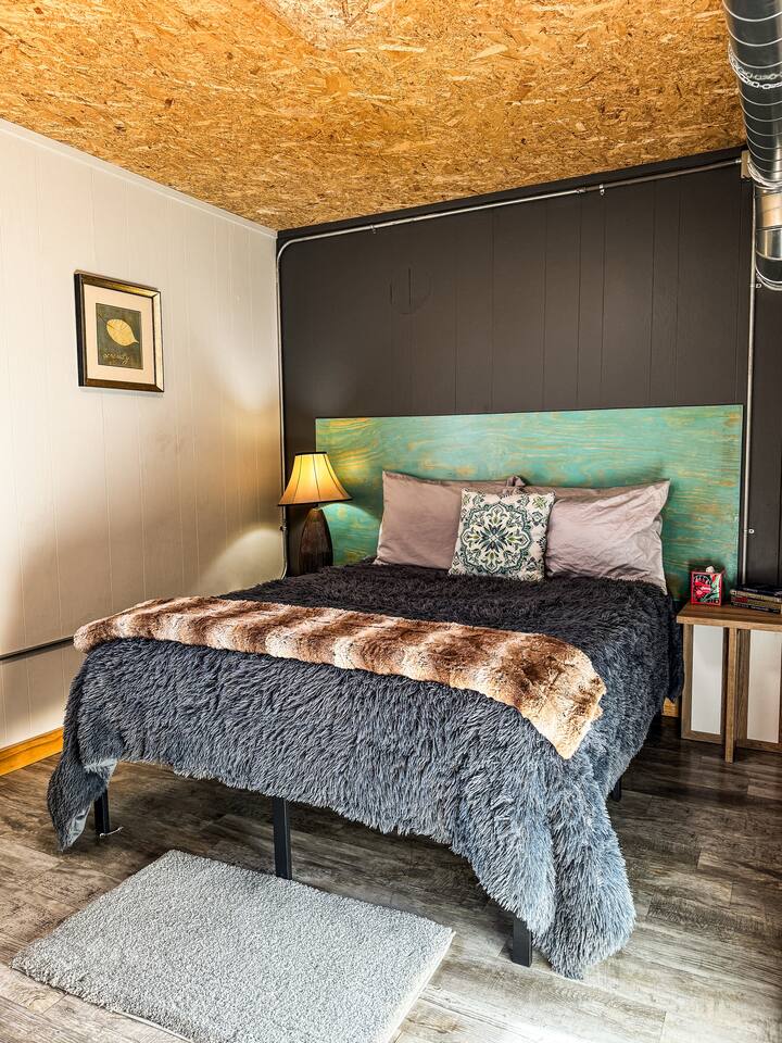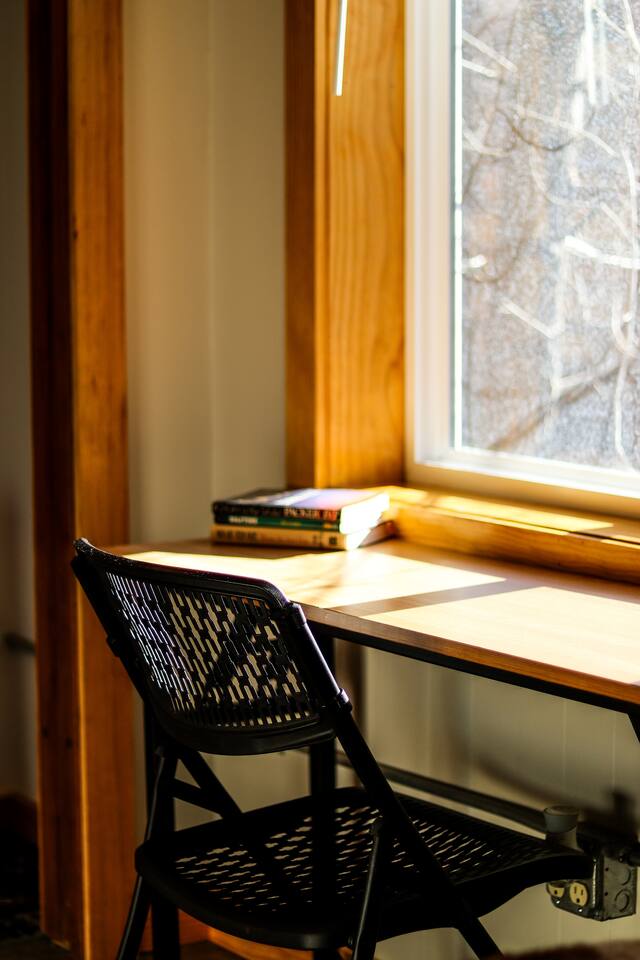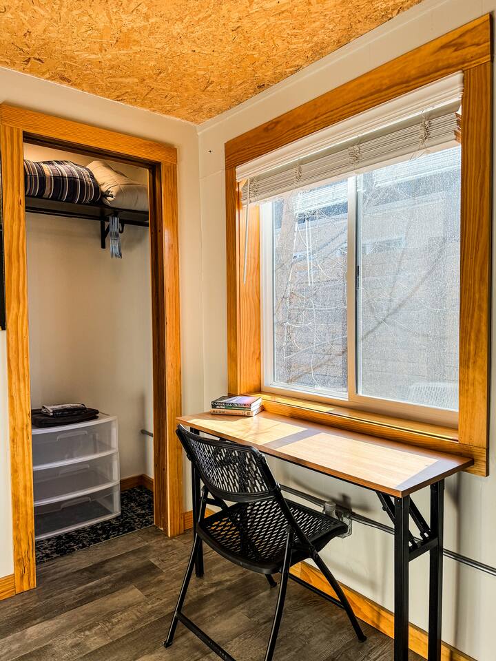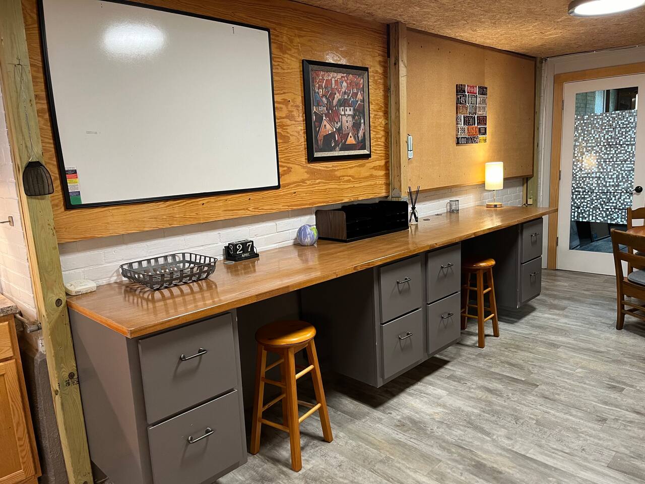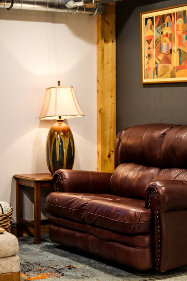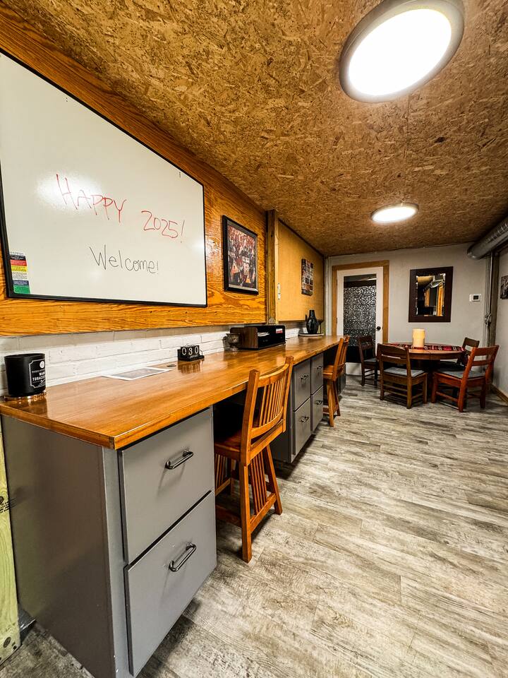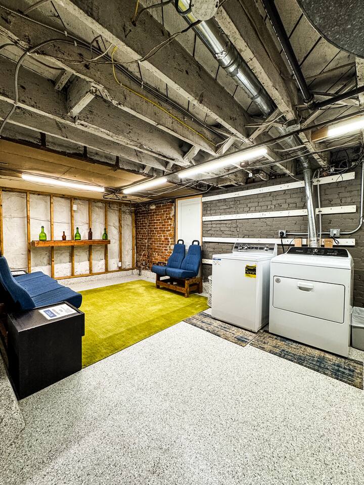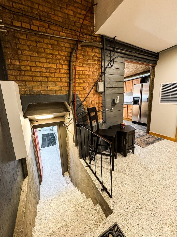 Cool industrial vibe. The three bedrooms, living room, kitchen and two work stations are on the ground level. The basement has the bathroom and laundry room.