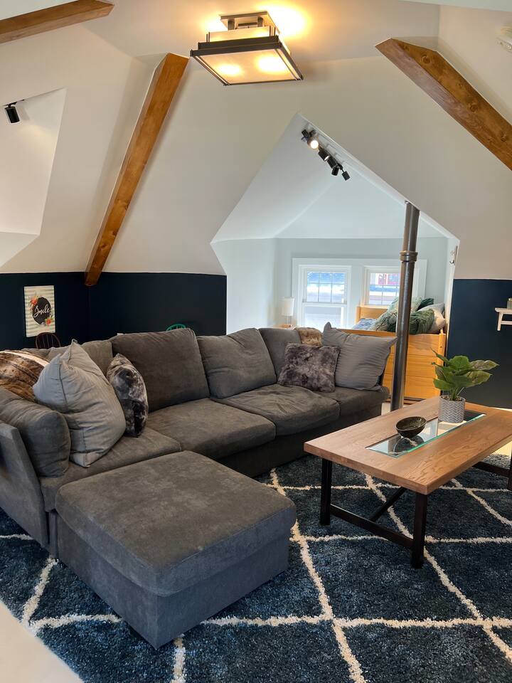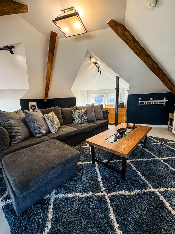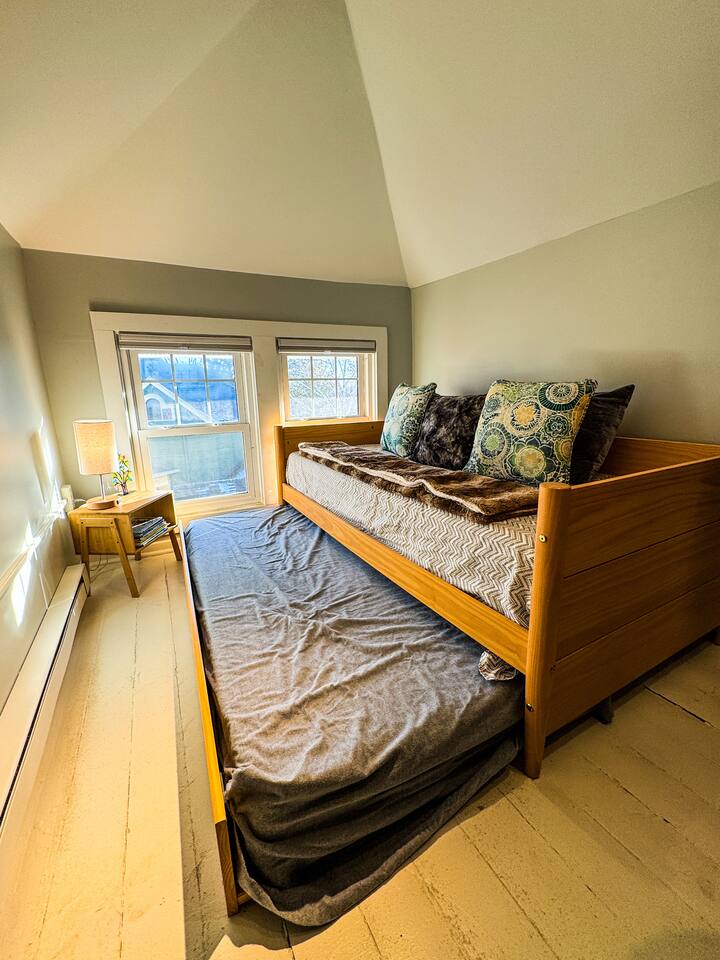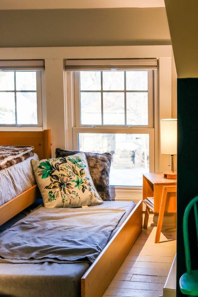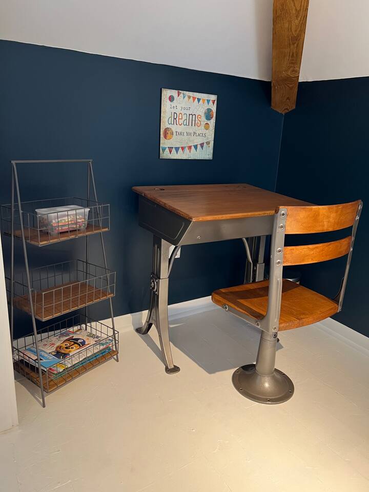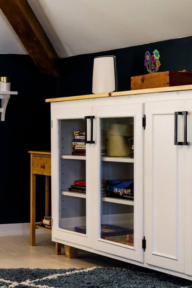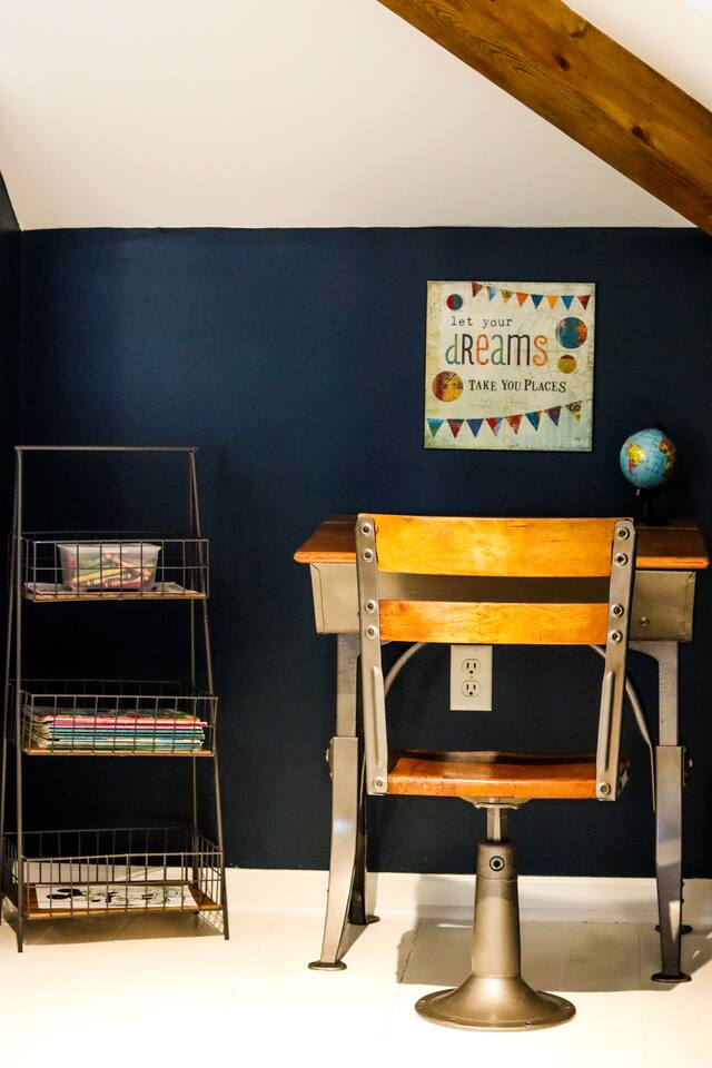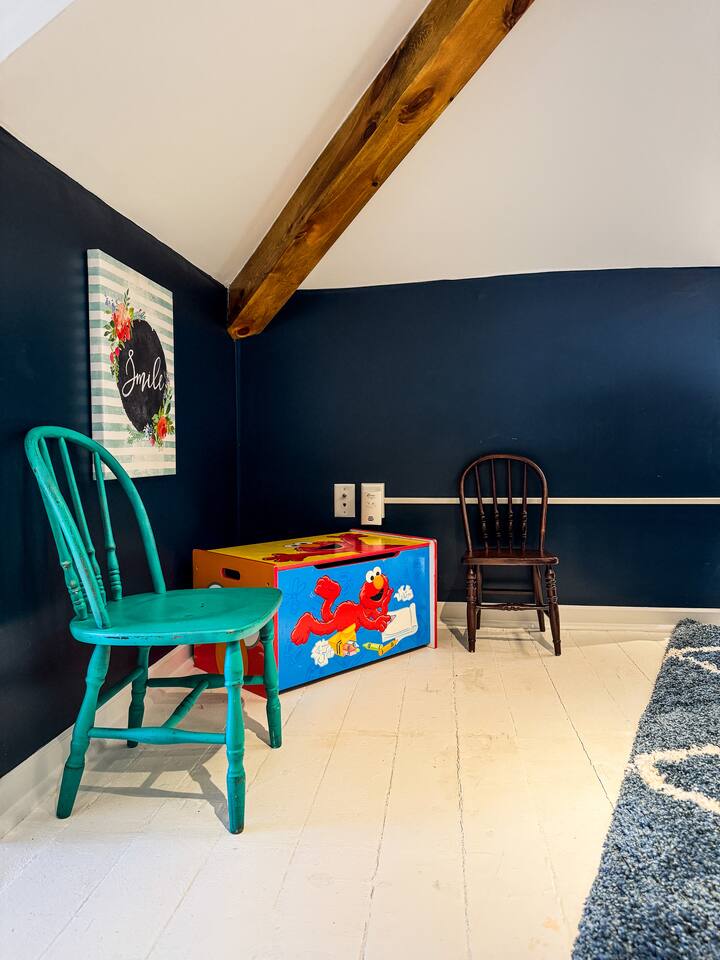 When my kids saw this unit they wanted to move in. I designed it for families to have fun and create memories. Books, puzzles, games, toys and attic nooks are a few of the things they will enjoy. Full eat-in kitchen with a view of the backyard has everything you’ll need. There is a crib and a desk in one of the debrooms. The beautifully finished attic has a sectional, TV, and two day beds each having an additional trundle bed as well. Kids love sleeping up there. Such a great space.