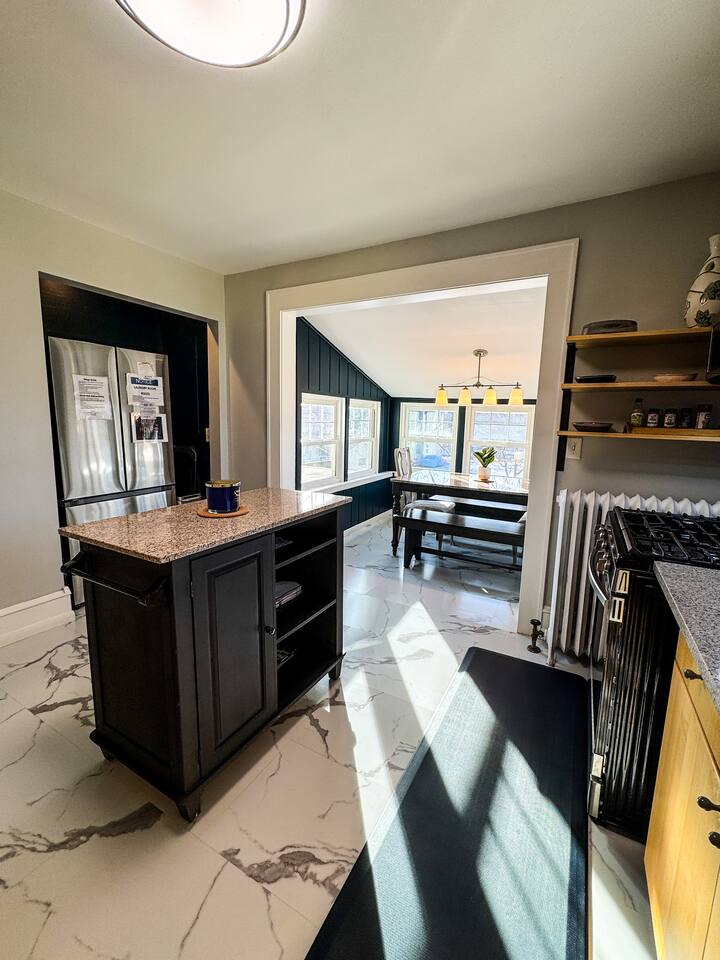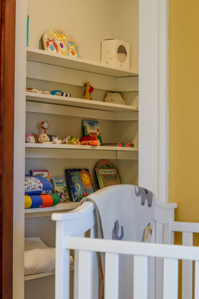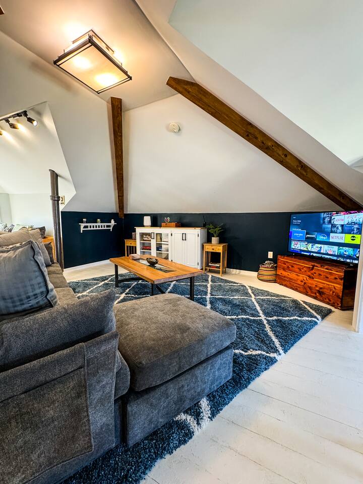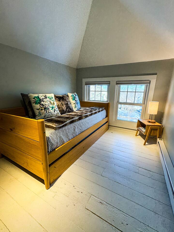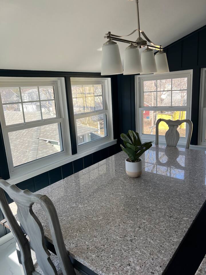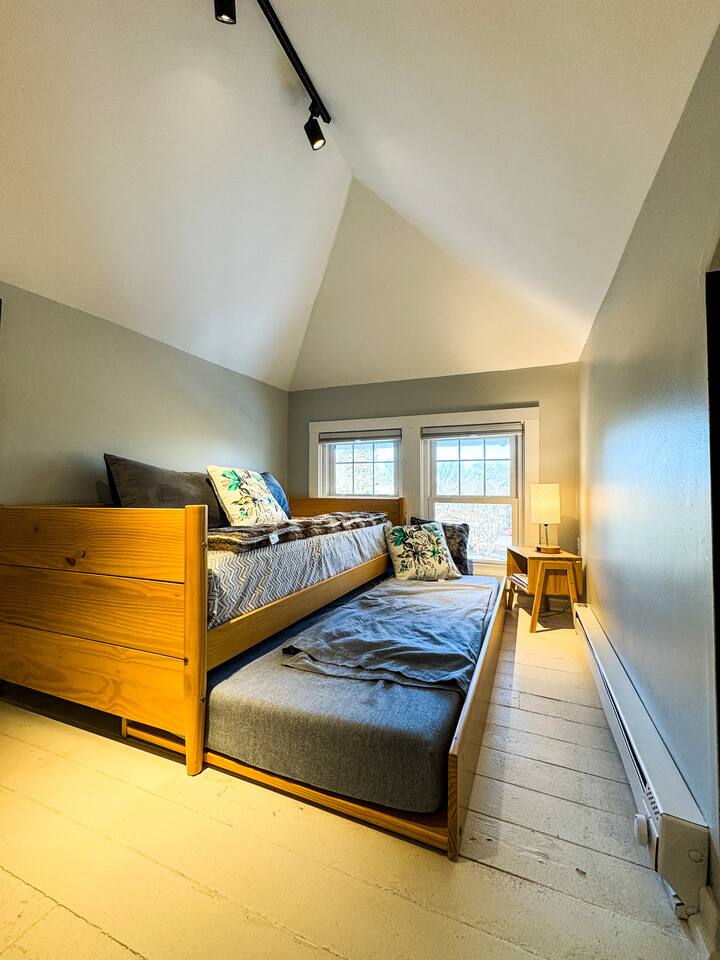 When my kids saw this unit they wanted to move in. I designed it for families to have fun and create memories. Books, puzzles, games, toys and attic nooks are a few of the things they will enjoy. Full eat-in kitchen with a view of the backyard has everything you’ll need. There is a crib and a desk in one of the debrooms. The beautifully finished attic has a sectional, TV, and two day beds each having an additional trundle bed as well. Kids love sleeping up there. Such a great space.